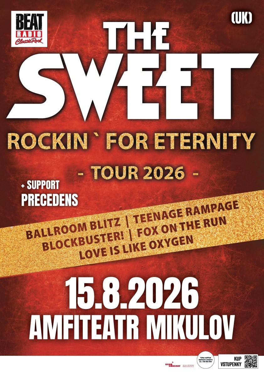 The Sweet /UK/ v MikulověLegendární britská kapela THE SWEET, která definovala glam rock a prodala přes 30 milionů alb, si pro svůj exkluzivní koncert v roce 2026 na Moravě vybrala Mikulov. 15. srpna 2026 vystoupí pod širým nebem v malebném Amfiteátru Mikulov.„Z obrovského množství nabídek jsme si v ČR vybrali právě Prahu a Mikulov. Chceme hrát tam, kde to má duši a atmosféru,“ říká Willi Wrede manažer kapely pro střední Evropu.The Sweet přivezou nejen výběr nesmrtelných hitů jako Ballroom Blitz, Fox On The Run, Love Is Like Oxygen, ale i nové skladby z úspěšného alba FULL CIRCLE, které se v roce 2024 vyšvihlo na 19. místo prestižních Media Control Charts.Kapela koncertovala v ČR pod hlavičkou agentury Brnokoncert již v roce 2017 v Praze a Brně, o rok později oslavila 50 let od svého vzniku v brněnském Sono Centru.S potěšením oznamujeme, že pozvání vystoupit před britskými The Sweet přijal vzácný host – jedna z nejuznávanějších českých kapel, skupina Precedens z Prahy. Kapela vystupuje na české scéně od osmdesátých let a natočila několik alb s Bárou Basikovou. Nedávno vydal Precedens skvělé album Odstíny černé. Precedens vystoupí ve složení: Martin Němec, Daniela Langrová, Karel Vošta,Pavel Nedoma, Zdeněk Imramovský a Tomáš Kašpar. Danielu Langrovou znáte mimo jiné z projektu Rock Opera Praha.