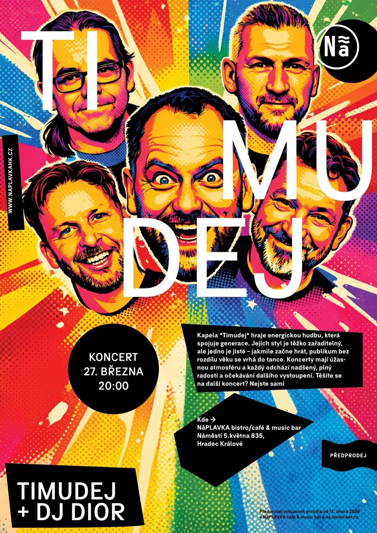 27.3.2026 / 20:00LIVE: TIMUDEJAFTER: dj DiorVstup: 300 Kč / 350 Kč ( předprodej/na místě )PŘEDPRODEJ / START 13.2.2026►SMSTICKET.cz ►►NA BARU ► v otevíracích hodináchKONCERT JE NA STÁNÍ!Na akci mohou být pořizovány audio-vizuální záznamy, určené k marketingovým účelům NãPLAVKA café & music bar.★ nekuřácký prostor★ wi-fi free★ bezbariérový přístup★ párty fotograf★ video projekcePokud nás chcete sledovat na FB, dostávat pozvánky na události a prohlížet fotky z akcí, přidejte si nás do přátel: https://www.facebook.com/naplavkahradec