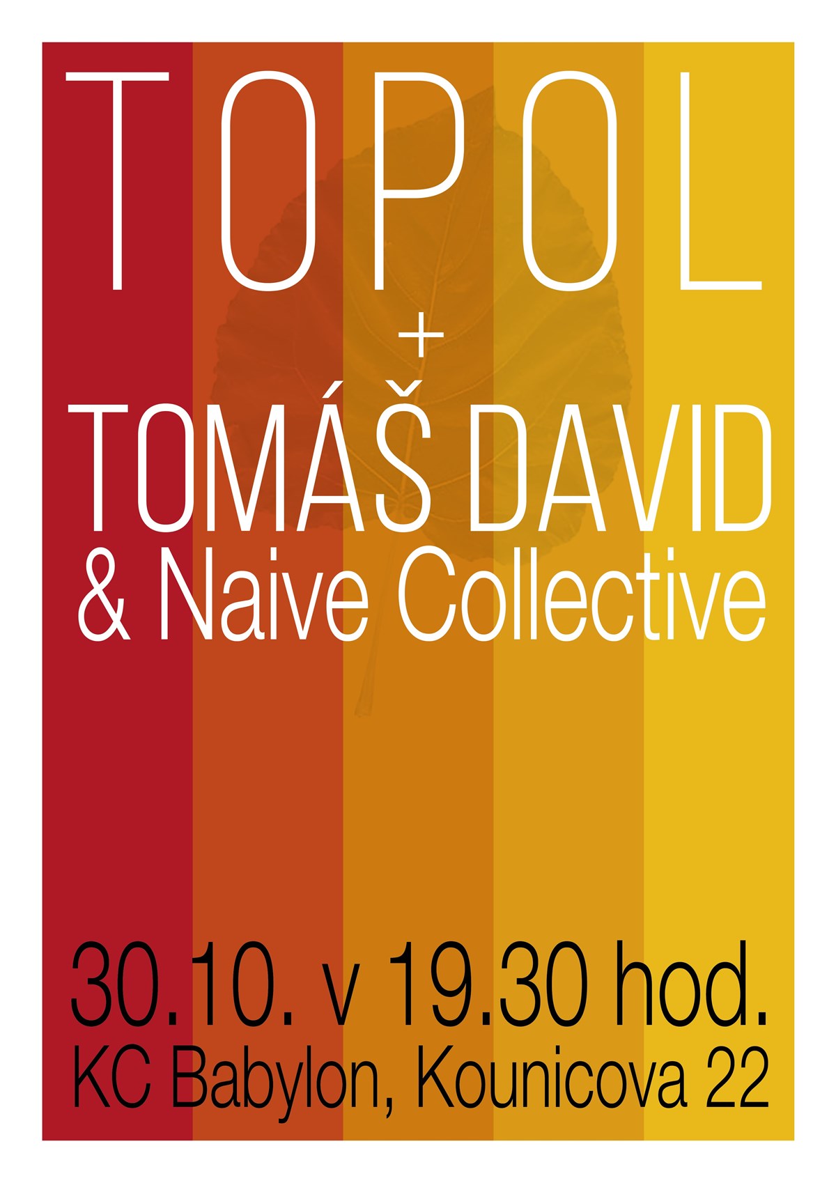 Po roce se kapela TOPOL vrací do KC Babylon, aby odehrála teď už tradiční podzimní koncert. Letos si k sobě přizvala spřízněnou kapelu Tomáš David & Naive Collective.19:00 otevření prostoru19:30 Tomáš David & Naive Collective20:30 TOPOL