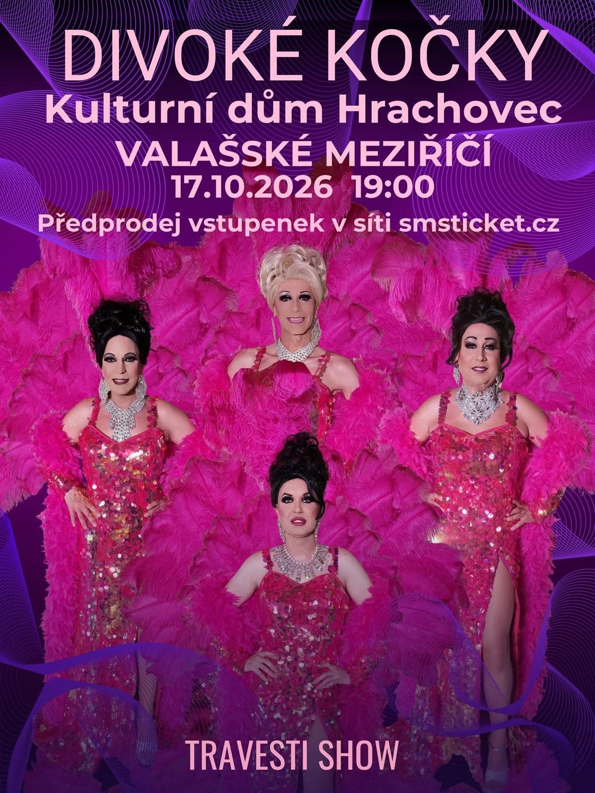 Travesti skupina Divoké kočky z Ostravy přijíždí v rámci svého turné se svým novým programem opět do Valašského Meziřičí, kde vystoupí v sobotu 17.10.2026 od 19:00 na sále kulturního domu Hrachovec. Délka programu s přestávkou 180 min.Celovečerní zábavný program je plný nezapomenutelných legračních scének, písniček, známých zpěvaček, krásných kostýmů, situačního humoru a hlavně smíchu a je vhodný jak pro ženské tak pánské publikum. Jejich vystoupení se těší stálé větší oblibě a tak si každý divák přijde na své. Přijdte se sami přesvědčit, že na travesti představení není nic špatného a v podání ostravských umělců se budete určitě dobře bavit.Divoké kočky jezdí se svým programem na valašsko pravidelně a proto se těší opět na úžasné místní publikum, atmosféru a skvělý večer. Na závěr programu Vám členové souboru ukážou svou pravou tvář.