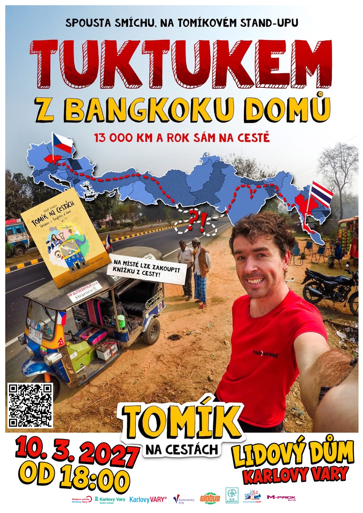 TUKTUKEM Z BANGKOKU DOMŮrok na cestě přes Thajsko, Indii, Nepál, Írán a TureckoNEUVĚŘITELNÁ CESTOVATELSKÁ SHOW, KTEROU MUSÍŠ ZAŽÍT!Zapomeň na klasické přednášky.Tohle je stand-up, film i dobrodružství v jednom.Tomáš Vejmola tě vezme na šílenou jízdu z Bangkoku až domů – přes půlku světa, bez zkušeností… ale s obrovskou dávkou odvahy. CO TĚ ČEKÁ?😂 Smích od první minuty🎥 Autentická videa z cesty📸 Fotky, které tě vtáhnou přímo do děje🌍 Inspirace, která tě nakopne💥 PŘÍBĚH, KTERÝ NEUVĚŘÍŠ👉 13 000 km👉 9 zemí👉 1 starý tuktuk👉 0 zkušeností🐘 Útěk před rozzuřeným slonem💍 Nabídky k sňatku🔧 Poruchy, které mohly všechno ukončit❤️ Lidé a zážitky, na které se nezapomínáPROČ PŘIJÍT?Protože tohle není jen o cestování.👉 Je to o odvaze👉 O snech👉 O tom prostě vyrazitDÉLKA PROGRAMUcca 120 minut