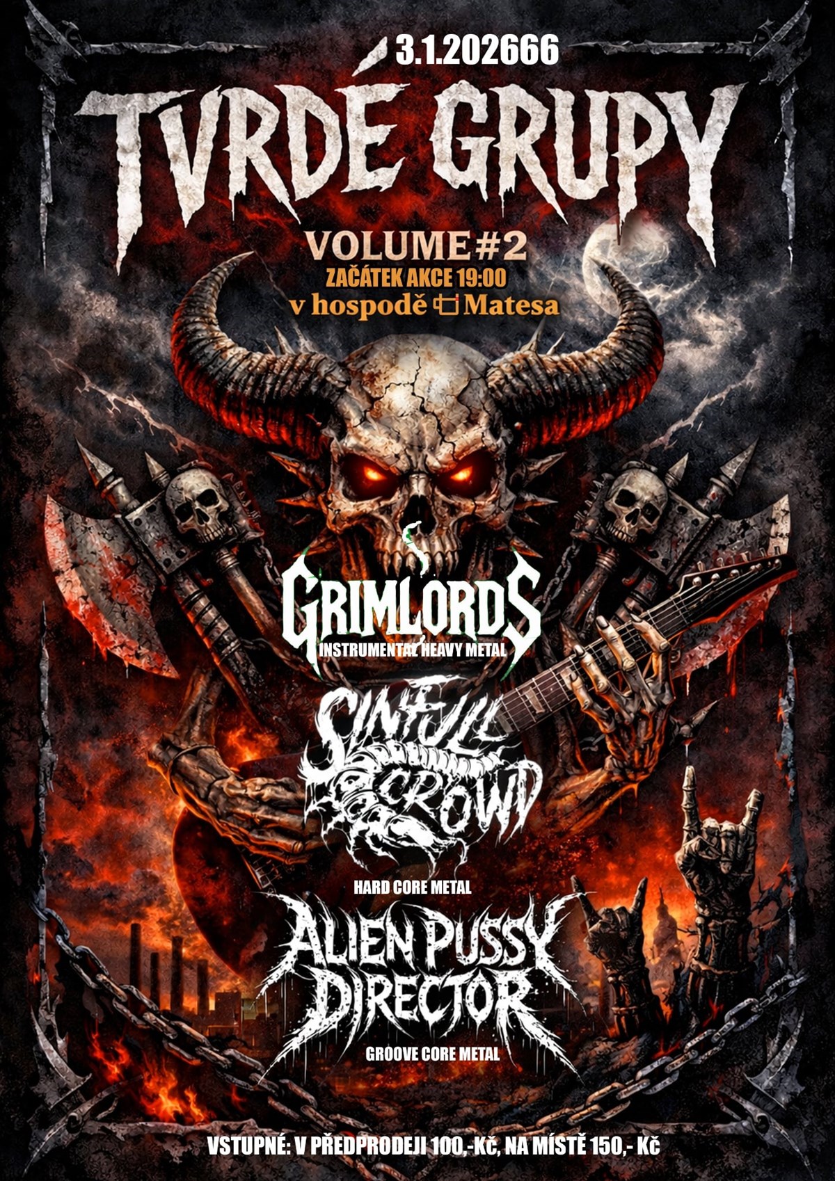 Pořádný brutal! Tři hard core a heavy metal kapely na živo u Matesa!BANDS:GRIMLORDS instrumental heavy metalSINFULL CROWD hard core metalALIEN PUSSY DIRECTOR groove core metalSTART 19:00ENTRY:100 CZK předprodej smsticket (90 lístků)150 CZK na místě