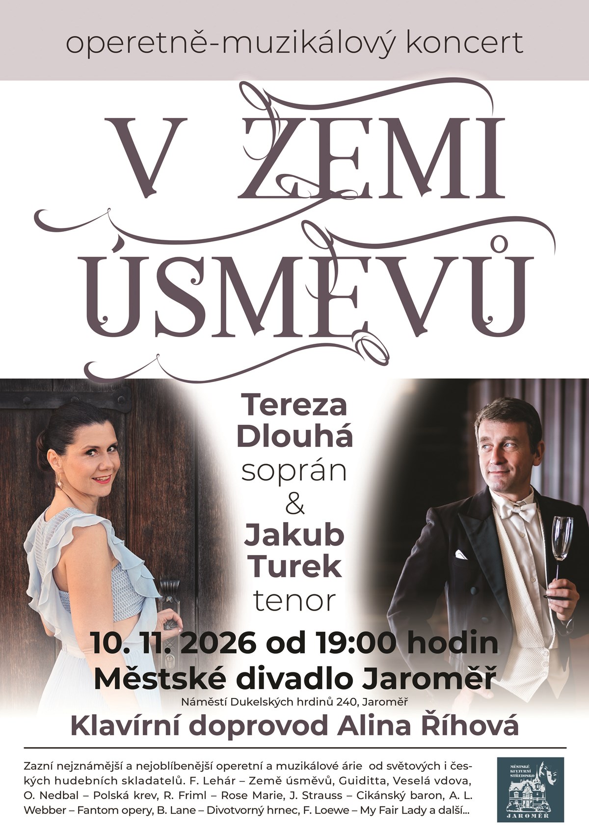 Spojení okouzlujícího zpěvu s působivým klavírním doprovodem Vás přenese do kouzelného světa operety a klasického muzikálu. V programu úspěšného koncertu sopranistky Tereza Dlouhé a tenoristy Jakuba Turka zazní nejznámější a nejkrásnější sólové árie i duety z operet Veselá vdova, Země úsměvů, Guiditta, Paganini (F. Lehár), Netopýr, Cikánský baron (J. Strauss), Rose Marie (R. Friml), Čardášová princezna (E. Kálmán), z muzikálů My Fair Lady (F. Loewe), Phantom of the Opera (A.L. Webber) a dalších...Tereza Dlouhá - sopránJakub Turek - tenorAlina Říhová - klavír