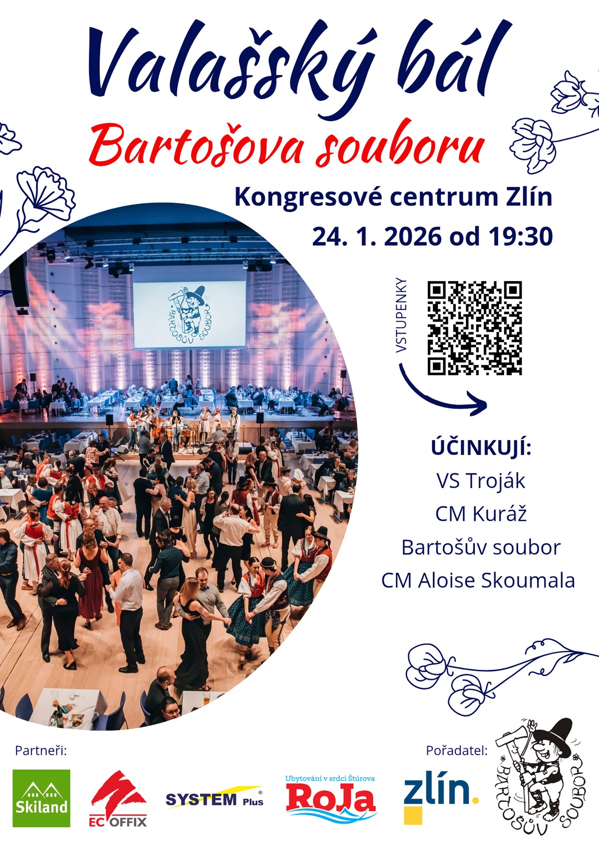 I v roce 2026 Vás mile rádi uvítáme v Kongresovém centru ve Zlíně na oblíbeném Valašském bále Bartošova souboru, který se bude konat v tradičním lednovém termínu.Letos budeme opět pokračovat v pravidelném střídání hostů z Valašska a Slovácka. Tentokrát se představí Valašský soubor Troják z Valašské Bystřice za doporvodu své cimbálové muziky. K tanci a poslechu bude hrát také další host, Cimbálová muzika Kuráž z Liptálu, a samozřejmě domácí Cimbálová muzika Aloise Skoumala.Těšit se můžete tradičně na bohatou tombolu, večerní překvapení a půlnoční hru Adam včetně trhání holubiček.