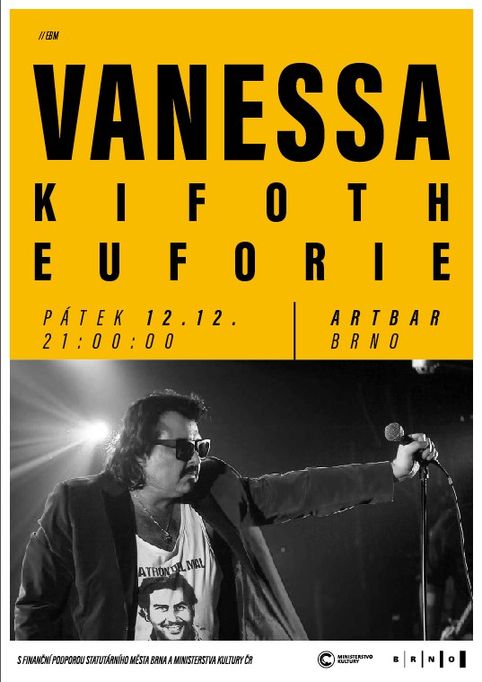 Poslední koncert pražské elektronické legendy v Brně. Support: KIFOTH (SK) + EuforieVANESSA se loučí! Končí jedna velká éra české elektronické hudby a ty u toho musíš být!VANESSA – kultovní jméno české elektroniky chystá poslední koncert v Brně. Industriální beaty, syrové texty, nihilismus, sex, drogy a EBM. Žádné retro, žádná nostalgie – jen současná temnota pro ty, co se nebojí.Na pódiu ARTBARu nastane 12. prosince peklo dle představ Samira Hausera. Jde o poslední koncert kapely v Brně - takže si ani nedokážeme představit, jaká divočina to bude.Vanessa nikdy nebyla jen kapela – byl to kult, trip do míst, kam se běžně nechodí.Jako support KIFOTH (SK) a Euforie.