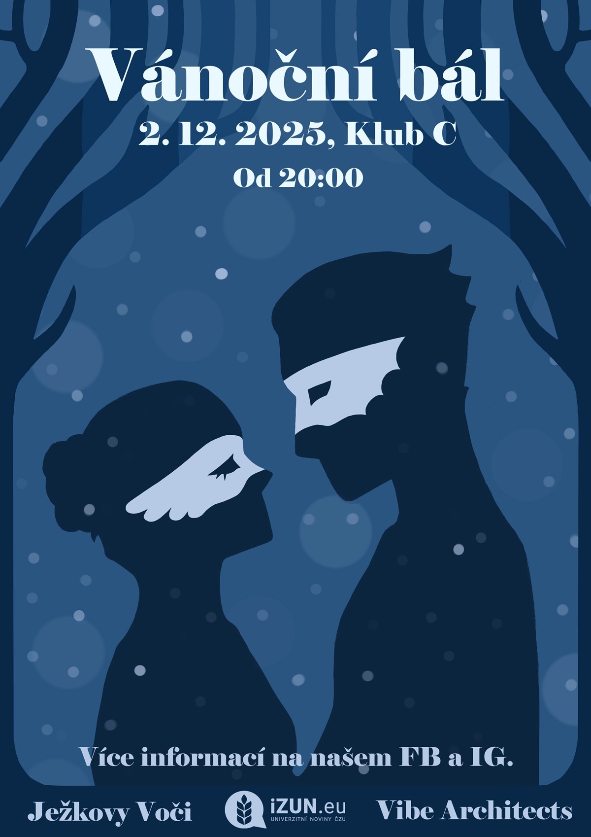 iZUN.eu Vás zve na večer plný elegance, magie a vánoční atmosféry!Pohádkový Vánoční bál, který vás přenese do kouzelného světa, kde se mísí elegance, šarm a slavnostní nálada. Ale nebojte, na party dojde taky Kdy: 2. 12. 2024 od 20:00Kde: Restaurace Klub CDresscode: Elegantní oděv a škrabošky – ukažte svůj styl a přidejte kousek tajemna! (není striktně podmínkou, ale budeme moc rádi, když ho dodržíte) Vstupné:V předprodeji - 1. Vlna 159,- (do 24.11.), 2. Vlna 179,- (od 24.11.), na místě 200,-Těšit se můžete na: Okouzlující taneční atmosféru Speciální vánoční playlist Welcome drink pro prvních 100 příchozích Soutěž o nejoriginálnější masku Dárečkování Fotokoutek pro kouzelné vzpomínky Parket, který vás nenechá sedět. Včetně společného tance. Šermířské a světelné vystoupeníPřijďte s námi prožít nezapomenutelný večer, který Vás vánočně naladí. Těšíme se na vás!iZUN.eu