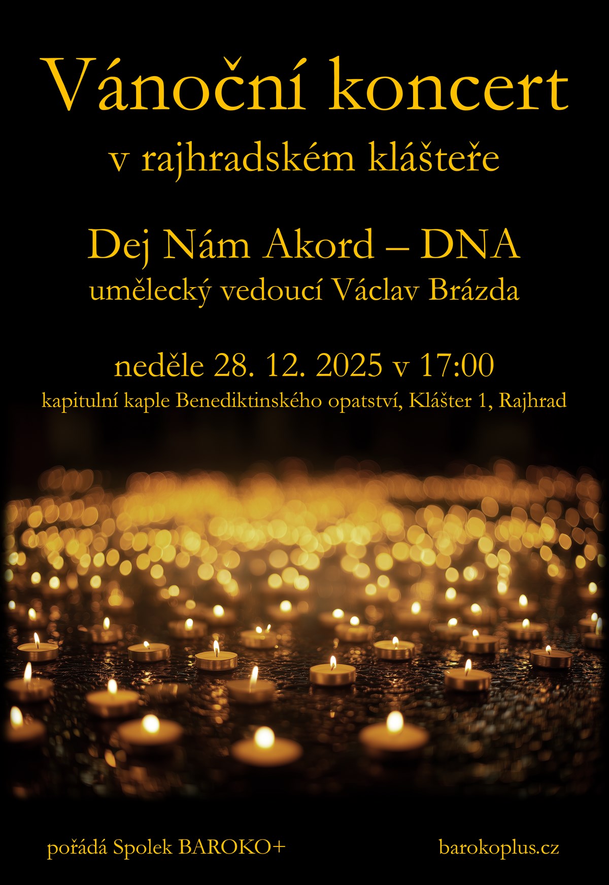 Zažijte kouzlo Vánoc v čistých tónech lidského hlasu. Skupina Dej Nám Akord – DNA Brno je vokálním (a cappella) souborem, který do rajhradského kláštera přichází s programem skladeb oslavujících vánoční radostnou zvěst. Program koncertu tvoří skladby Adama Michny z Otradovic, autorské kompozice Tomáše Přikryla a výběr lidových koled, které společně vytvářejí hudební oslavu radostné zvěsti Vánoc.