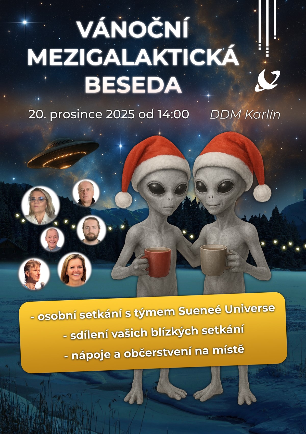 Zveme vás na setkání přátel a fanoušků zpravodajského serveru Sueneé Universe, Zprávy z Galaxie a....! Po roce intezivního přílivu informací a tvoření nových perspektiv existence si pojďme společně jen tak povídat a plynout v době Zimního slunovratu.Hosté večera:Ada InnemanAndrea Svobodová-KřešováAlexandra McKenzieJan Procházka aka Kámoši z kosmuKarel RašínLeontýnkaSueneéVáclav QAD Urban... další na cestě Program setkání:13:30 ... Prostor je pro vás otevřen... program je překvapení. Brzy jej odhalíme...21:00 ... Předpokládaný konecV ceně vstupenky je rezervace jednoho místa. Na místě bude stánkový prodej pití, občerstvení a ezoterického zboží. Platba možná pouze v hotovosti CZK nebo EUR.