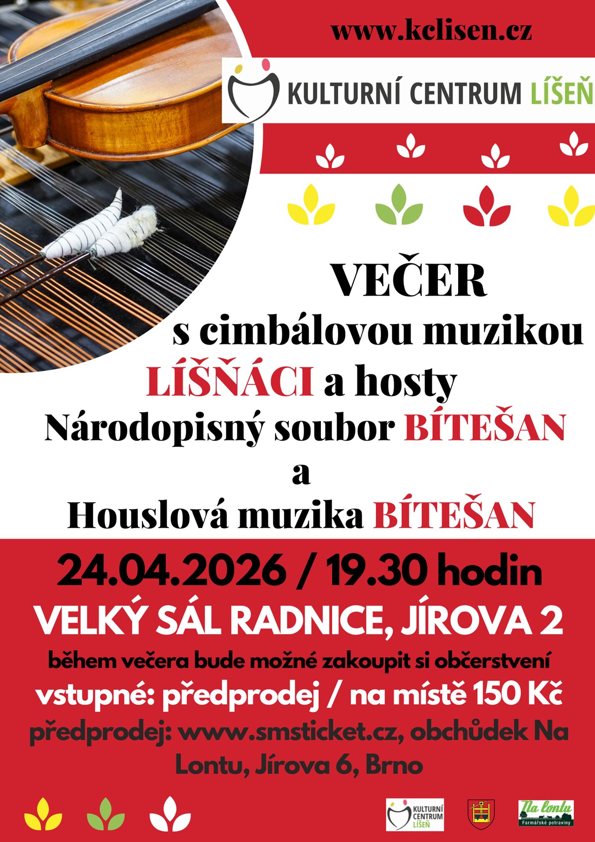 Pátek 24.04.26 v 19.30 VEČER U CIMBÁLU Přijďte si zatancovat, poslechnout i zazpívat oblíbené i méně známé lidové písně v podání Cimbálové muziky Líšňáci a jejich hostů. Můžete se těšit na uvolněnou atmosféru, zpěv, občerstvení a taneční parket, na kterém rozhodně nebudete sami!Akce se koná ve velkém sálu radnice městské části Brno - Líšeň. Vstupné: 150,- Kč. Předprodej: www.kclisen.cz, www.smsticket, obchůdek Na Lontu, Jírova 6, Brno-Líšeň. Vstupenky je možné zakoupit i na místě, kapacita sálu je však omezená. Akce se koná každý poslední pátek v měsíci (29.5.26 a 19.6. od 18 do 22 hodin na zahradě Dělňáku v Líšni)