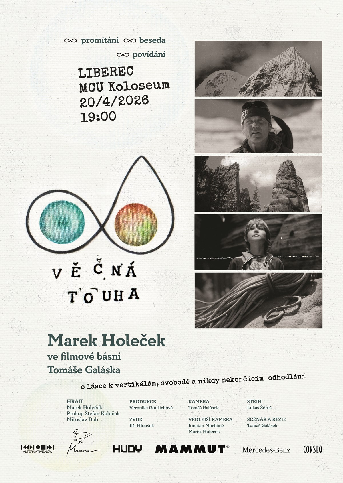 PROMÍTÁNÍ / BESEDA / POVÍDÁNÍ ∞ VĚČNÁ TOUHA ∞ horolezec a cestovatel Marek Holečekve filmové básni režiséra Tomáše Galáska o lásce k vertikálám, svobodě a nikdy nekončícím odhodlání "Kde a jak vzniká touha, ta potvůrka, která mi nedá klidu? Má v sobě nesmlouvavou agresivitu se schopností zahryznout se do snů a neopouští mě ani při otevření očí. Stále se vrací v ucelenějším obrazu, který je čím dál barevnější. Stává se každodenní součástí a vlastně už i reálným prožitkem. Cítím napětí, teplo i chlad, okolní vůně, proudění vzduchu ve vlasech, uspokojení a pevné pouto přátelství, spojené lanem, obklopen tichou krásou hor. Někdy je dlouho uschovaná hluboko v mysli, aniž by byl vykonán jediný pohyb. Může zůstat i nenaplněná, však raději než zůstat stát, jsem vykročil pro odpověď. Touha je nekonečná a nelze se jí přesytit. Přenáší mě přes překážky, vyhání z tepla i bezpečí domova. Přicházejí prohry a někdy i úspěch, za kterým se otevírá jen další nová cesta.Možná odpověď na mou těkavost leží někde v dětství, s prvními uzly, které mě táta učil a v prvních skalních výstupech, které jsme spolu vylezli. Ta klukovská zvědavost i snění mně nikdy neopustilo a provází dál celým životem.Jak se vše povedlo zachytit, musíte posoudit sami, a pak se mě můžete ptát až do vyčerpání, na co budete chtít.“Maara Premiérové uvedení filmu doprovázené osobním vystoupením a vyprávěním Marka Holečka a setkáním s tvůrci snímku. Po projekci proběhne otevřená debata.Délka akce: cca 120 min bez přestávky O FILMUVěčná touha je poetická filmová báseň o Marku Holečkovi sledující jeho vášeň pro horolezectví a hluboké spojení s horami. Paralelně s jeho současnou expedicí v centrálním Himálaji se vracíme do dětství, kdy poprvé překonal strach a objevil svou životní cestu. Film je vizuální meditací o odvaze, svobodě a nekonečné přitažlivosti hor. Rok výroby: 2026Země produkce: Česká republikaDatum premiéry: 14. 4. 2026, Kino Lucerna, PrahaStopáž: 20 min Hrají: Marek Holeček, Prokop Štefan Koleňák, Miroslav DubScénář a režie: Tomáš GalásekProdukce: Veronika GöttlichováKamera: Tomáš GalásekVedlejší kamera: Jonatan Macháně, Marek HolečekStřih: Lukáš ŠerešZvuk: Jiří HloušekGrafika: Veronika Göttlichováwww.facebook.com/Alternative.NOW