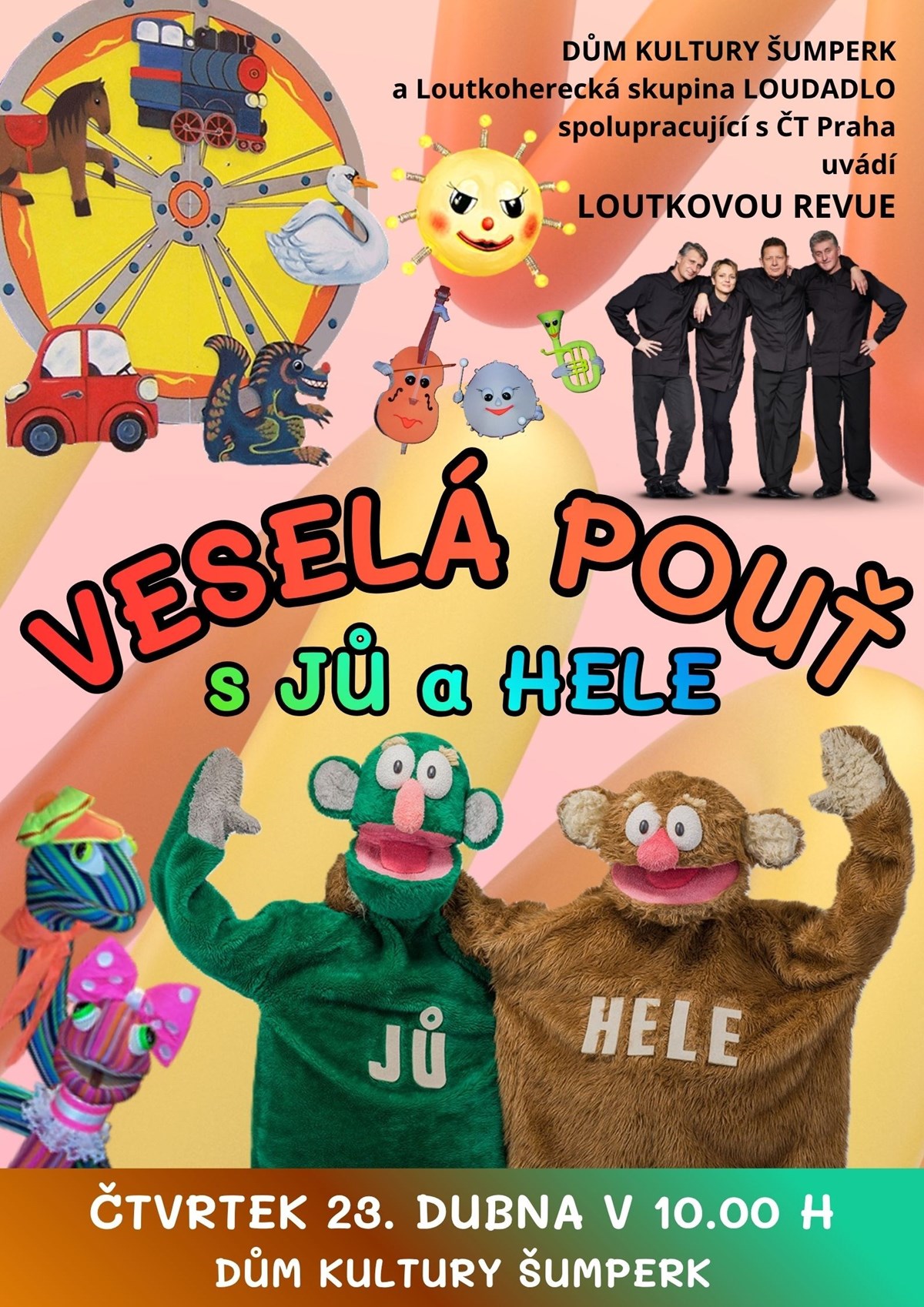 Už samotný název nás zavádí tam, kam děti s rodiči velice rádi chodí - do světa hudby, kolotočů a říše cizokrajných zvířat. Na pouti se s vámi setkají také dvě roztomilá strašidla KRYŠPÍN a TÁHLO, JEŽIBABA a neposední hadi. V představení nás navštíví JŮ a HELE a společně se přeneseme do míst plných kouzel, zábavy a legrace.„HOLA, HOLA, POUŤ VÁS VOLÁ!"Autory jsou Peter Ďurica, Ernest Val'ko a jejich osvědčený realizační tým:hudba - Vincent Jaš,texty - Jana Ozoráková,scénografie a loutky - Dana Malá Účinkuje: Loutkoherecká skupina LOUDADLO spolupracující s Českou televizí PrahaVstupné: 120 Kč