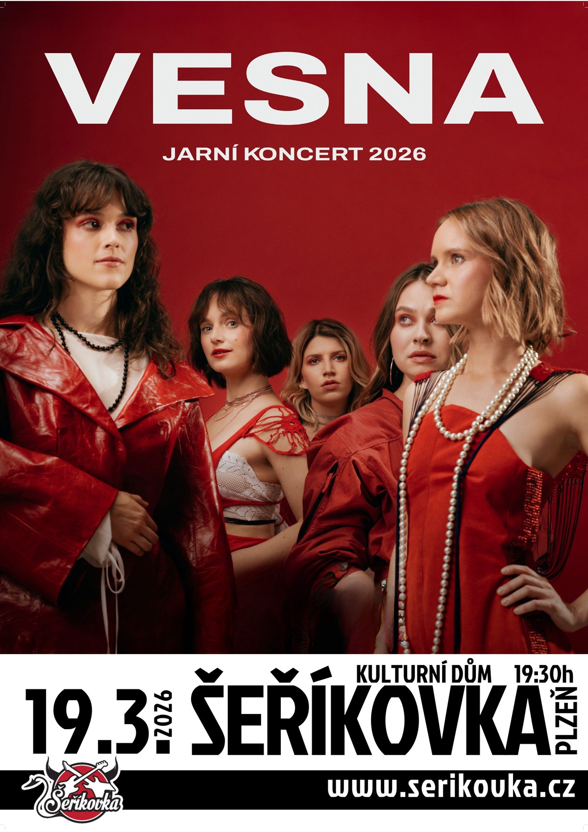 Vesna je výrazná dívčí kapela spojující moderní pop s folklorními a slovanskými prvky. Jejich hudba přináší originální zvuk, silné texty a vizuálně poutavé vystoupení. V roce 2023 zaujaly celou Evropu, když reprezentovaly Českou republiku na Eurovision Song Contest a od té doby jejich popularita neustále roste.19.3.2026 vystoupí i v plzeňské Šeříkovce. Vystoupení Vesny je dynamické a vizuálně atraktivní – propojuje moderní zvuk s prvky lidové hudby, originálními kostýmy a energií, která dokáže strhnout široké publikum.