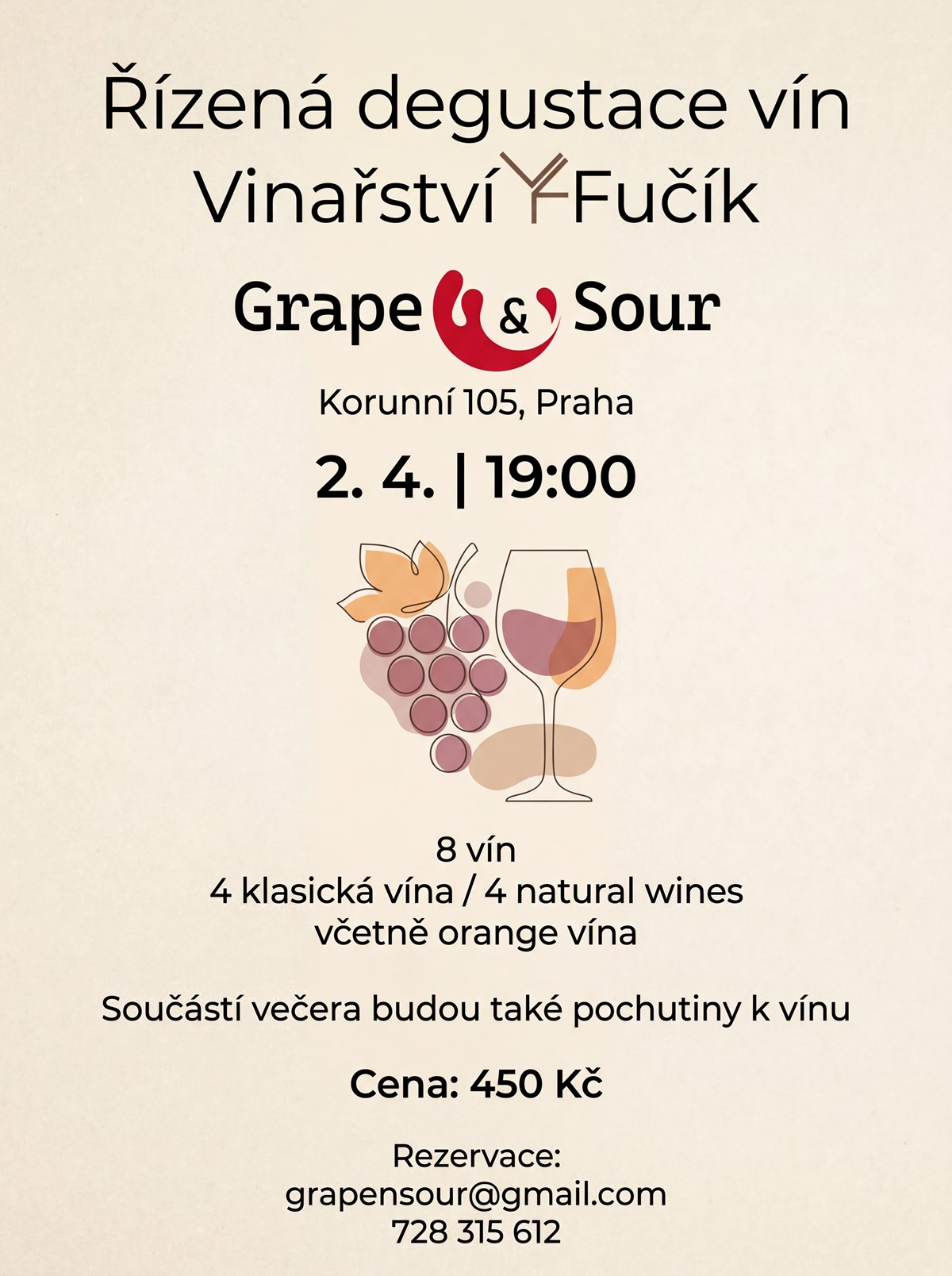 Další řízená degustace v Grape&SourVinařství FučíkZveme vás na další večer s moravským vinařem, tentokrát představíme vína z Vinařství Fučík.Čeká vás ochutnávka 8 vín:4 klasická vína a 4 natural wines, včetně orange vína.Degustace bude pohodová, přehledná a vhodná jak pro milovníky klasiky, tak pro ty, kteří chtějí objevovat moderní styl vín.Součástí večera budou také pochutiny k vínu.Těšíme se na vás v Grape&Sour
