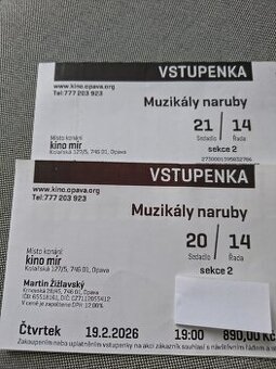 Prodám dvě vstupenky do opavského kina Mír. Z důvodu nemoci . Osobní odběr Opava . Cena za kus 890 Kč.