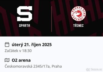 Prodám vstupenky (všechny vedle sebe) na hokejový zápas HC Sparta Praha vs. HC Oceláři Třinec. Výborná místa v exkluzivním sektoru 110 s perfektním výhledem na ledovou plochu.