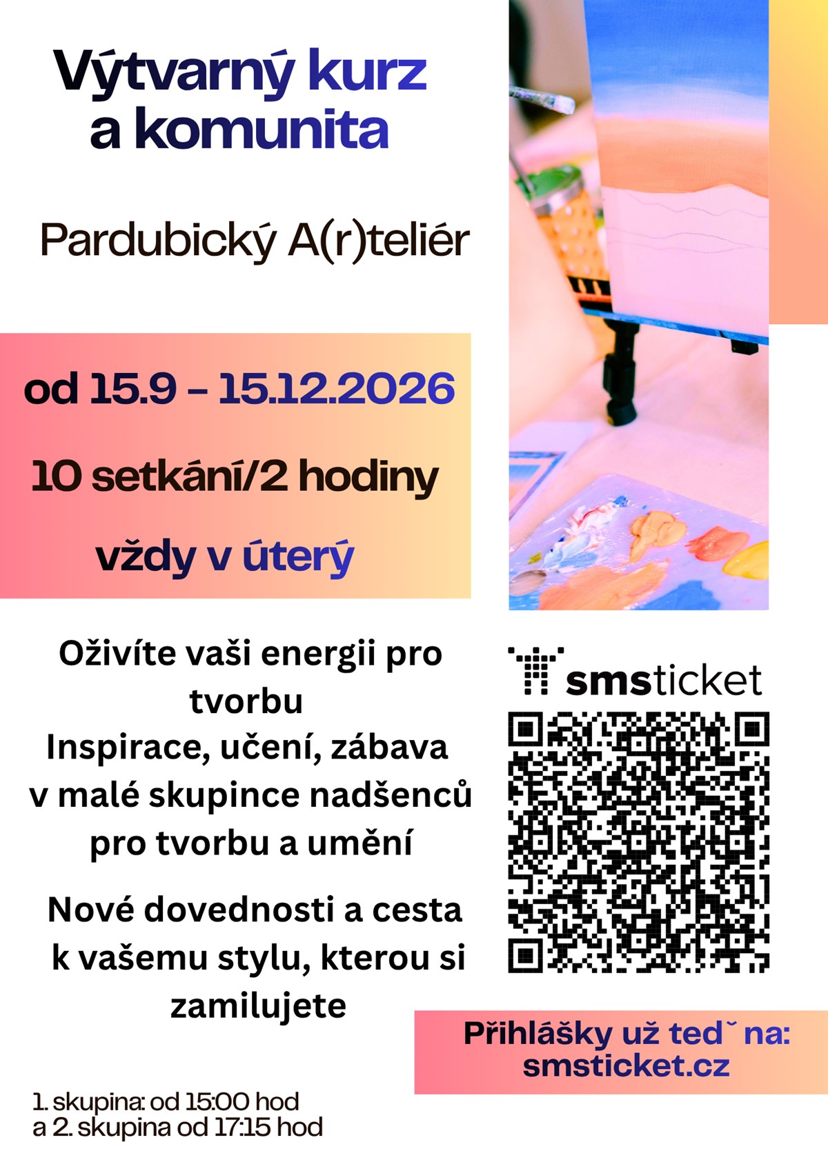Zveme vás na střednědobý výtvarný kurz a komunitu:“Pardubický výtvarný a(r)teliér”.Od 15. 9 - 15. 12. 2026. Proč se přihlásit a být součástí nejen kurzu ale i komunitky?Protože tohle je podpůrná, pohodová komunita pro tvořivé lidi.Žádný stres. Žádné „musím“. Jen radost z procesu.Zapomenete na:„Nemám doma prostor, čas, energii, náladu atd”.„Než to všechno připravím, tak mě to přejde“.Pobíhající děti, kočky nebo psy, co shazují stojan, nebo je ohromně zajímá, jak barva chutná.Obavy z nepořádku.Tady bude vaše místo a váš čas.Prostor, kde:si dovolíte zpomalitponoříte se do flowbudete tvořit bez tlaku a hodnocenívyzkoušíte si malbu i kombinované technikyzískáte více jistoty a jasnější vizi, co je ten “váš styl” konečněa hlavně, budete mezi lidmi, kteří to cítí podobně budete součásti malé skupinky, 12 lidí max.A na konci kurzu si můžeme uspořádat i vernisáž toho nejlepšího. Jak budou kurzy probíhat? Kurz má 10 setkání. Každé trvá 2 hodinky /120 minut/. Vždy v úterý. Otevíráme 2 skupinky, datumy i program jsou stejné, liší se jenom časem začátku kurzu. 1. skupinka: od 15:00 - 17:00 hod 2. skupina: od 17:15 - 19:15 hod Tak co, přidáte se? Přihlášky jsou otevřené už teď. Těšíme se na Vás.