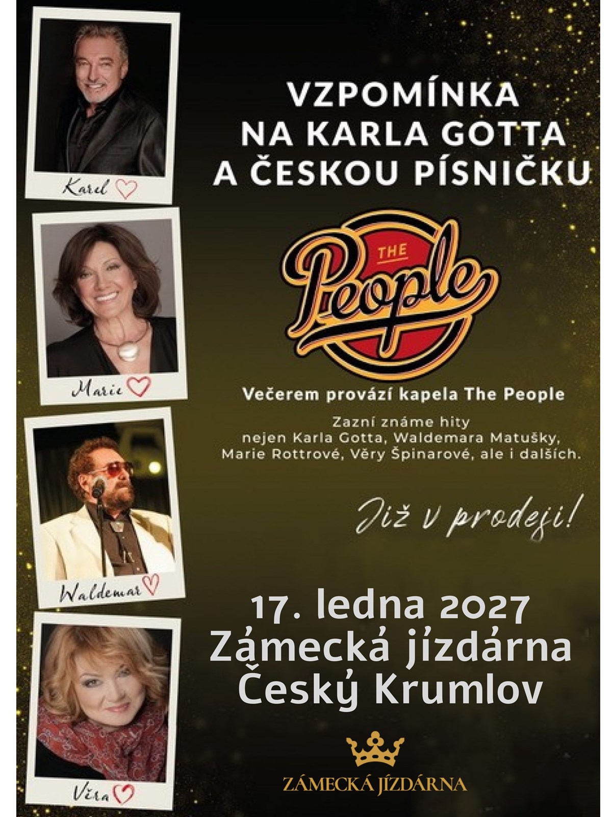 Přijměte pozvání na jedinečný koncert, kde v podání kapely The People zazní nesmrtelné písně Karla Gotta, Marie Rottrové, Waldemara Matušky, Věry Špinarové a dalších známých českých zpěváků.Pop-rockové hity + vlastní tvorba • Energická show ideální pro hlavní i vedlejší festivalová pódia • Speciální český projekt k poctě Českému rozhlasu - Vzpomínka na Karla Gotta a českou písničku