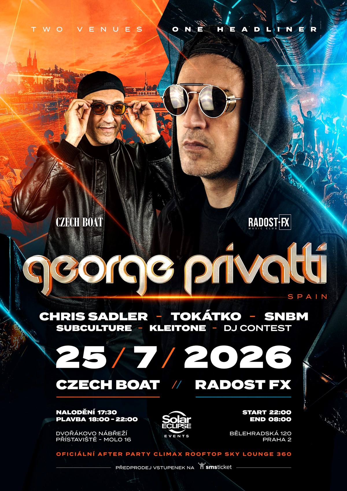 🔥 DVA PROSTORY. JEDEN HEADLINER. NEZAPOMENUTELNÝ ZÁŽITEK. 🔥Připrav se na jedinečný hudební event, který propojí atmosféru letní plavby s energií nočního klubu.Hlavní hvězdou večera je George Privatti (Spain), který tě vezme na nezapomenutelnou hudební jízdu.Line-up:George PrivattiChris SadlerTokátkoSNBMSubcultureKleitoneDJ ContestCzech Boat• Nalodění: 17:30• Plavba: 18:00 – 22:00Dvořákovo nábřeží, molo 16Radost FX Music Club• Start: 22:00• End: 08:00Bělehradská 120, Praha 2Oficiální afterparty: Climax Rooftop Sky Lounge 360Zažij spojení letního vibeu, kvalitní elektronické hudby a jedinečné atmosféry ve dvou ikonických lokalitách.