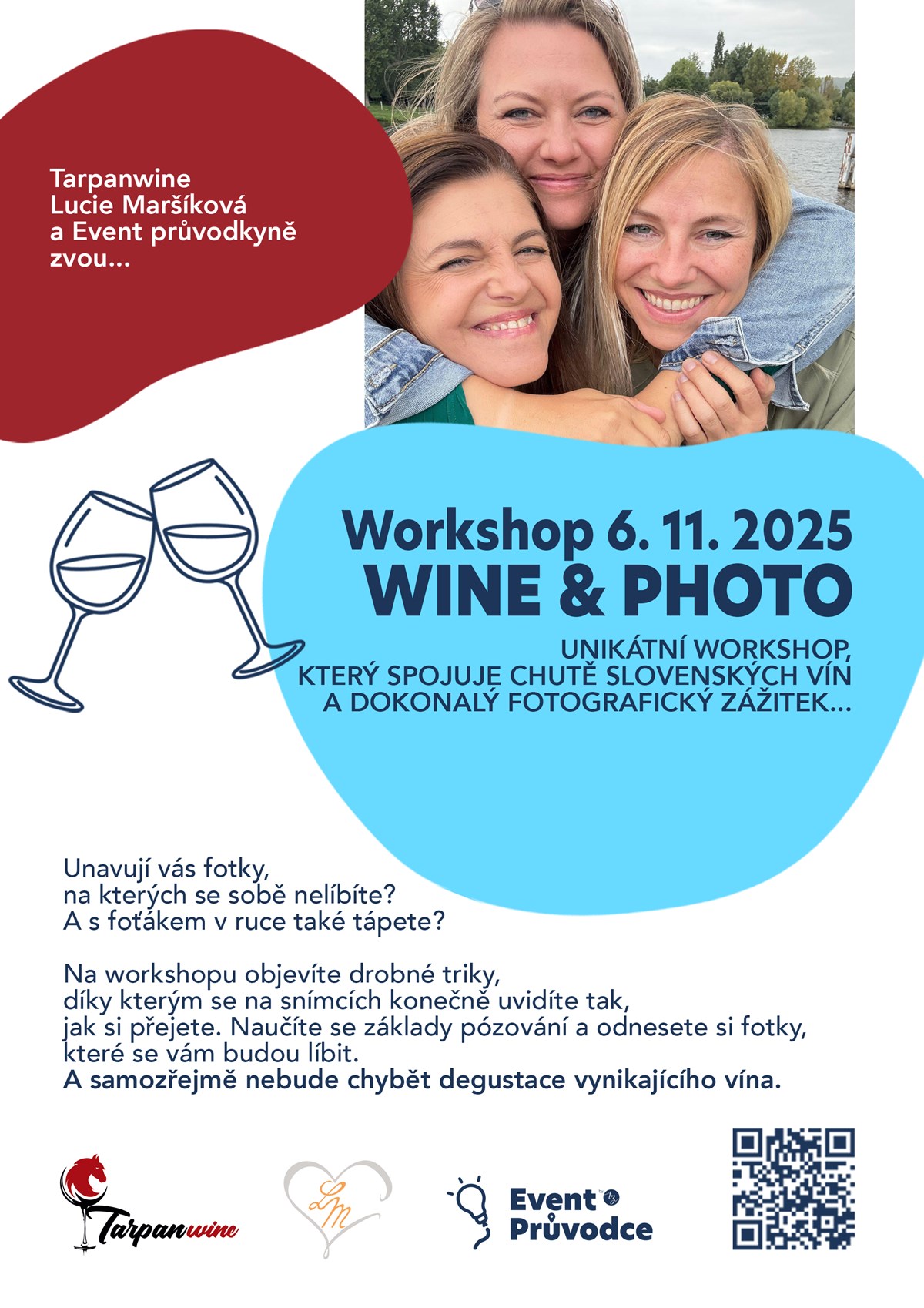 Večer slovenského vína a dokonalého portrétuO co jde?Představte si večer, kdy se dva světy spojí v jedinečný zážitek. Svět vína, které rozproudí vaše smysly, a svět fotografie, která zachytí vaši krásu v tom nejlepším světle.Sklenička v ruce a postupné objevování tajů vinařského umění vás uvolní a připraví na druhou část večera, moment, kdy se naučíte, jak vypadat na fotografiích přirozeně a krásně, sebevědomá a okouzlující – ať už je za fotoaparátem profesionál nebo přítel s mobilem. Moment, kdy se naučíte umění portrétu – jak fotit ženu tak, aby vypadala co nejlépe i s obyčejným mobilem.Večer, který vás nejen naučí nové dovednosti, ale především vám ukáže, jak vidět svou vlastní krásu novýma očima.