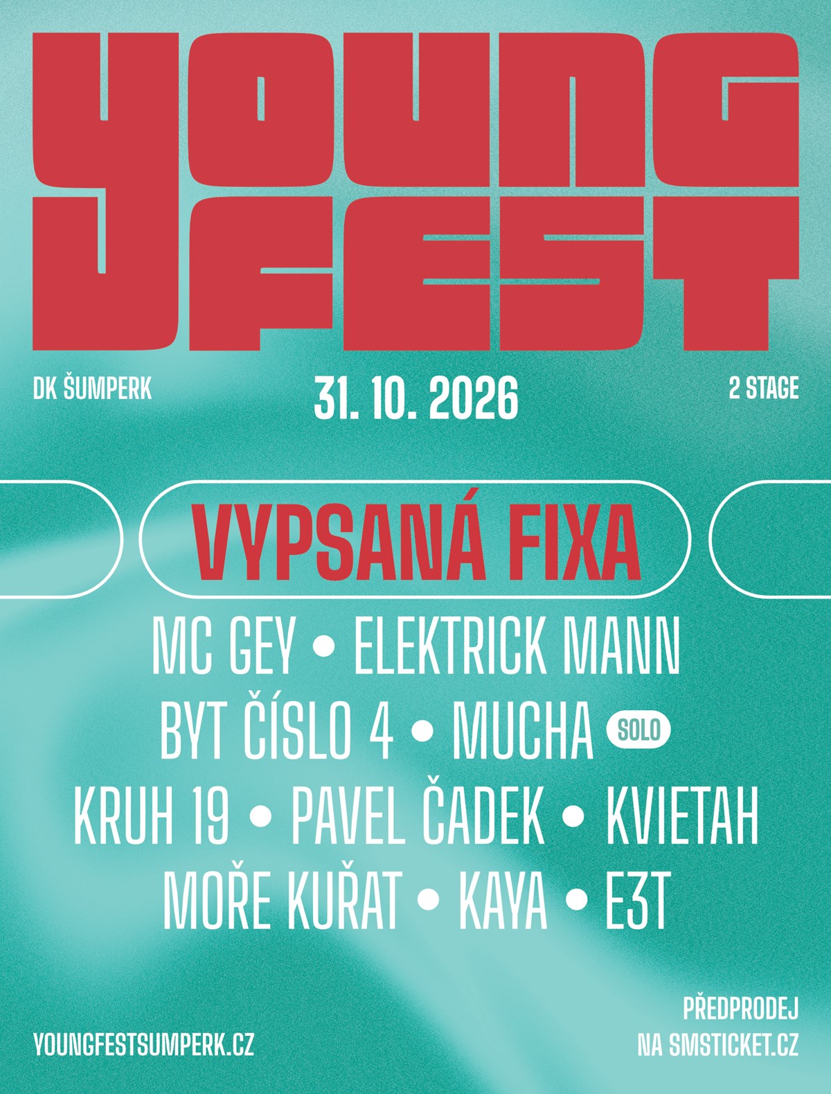 Festival Youngfest Šumperk přitáhne Vypsanou Fixu s novou deskou!Oblíbenou šumperskou akci čeká velký krok a na svůj pátý ročník se přesouvá do Domu Kultury Šumperk, kde kromě zmíněných hvězd uvítá také oblíbeného MC Geye, stálice Elektrick Mann či Mucha nebo domácí Byt číslo 4. Line-up doplňuje pestrá řada oblíbených a úspěšných mladých umělců, Kterými jsou Kruh 19, Pavel Čadek, Kvietah, Moře Kuřat, Kaya a svůj doposud největší koncert zde odehraje nová šumperská naděje E3T.Festival s původní myšlenkou zaměřenou na mladé a nadějné umělce překračuje své hranice a otevírá se všem generacím, přičemž stále neztrácí svou tvář. Ostřílené české legendy, ale i pořádný výběr kvalitní hudby od mladých kapel a muzikantů. To je YOUNGFEST.1 večer, 2 pódia, 11 umělců, Dům Kultury a hlavně VY!