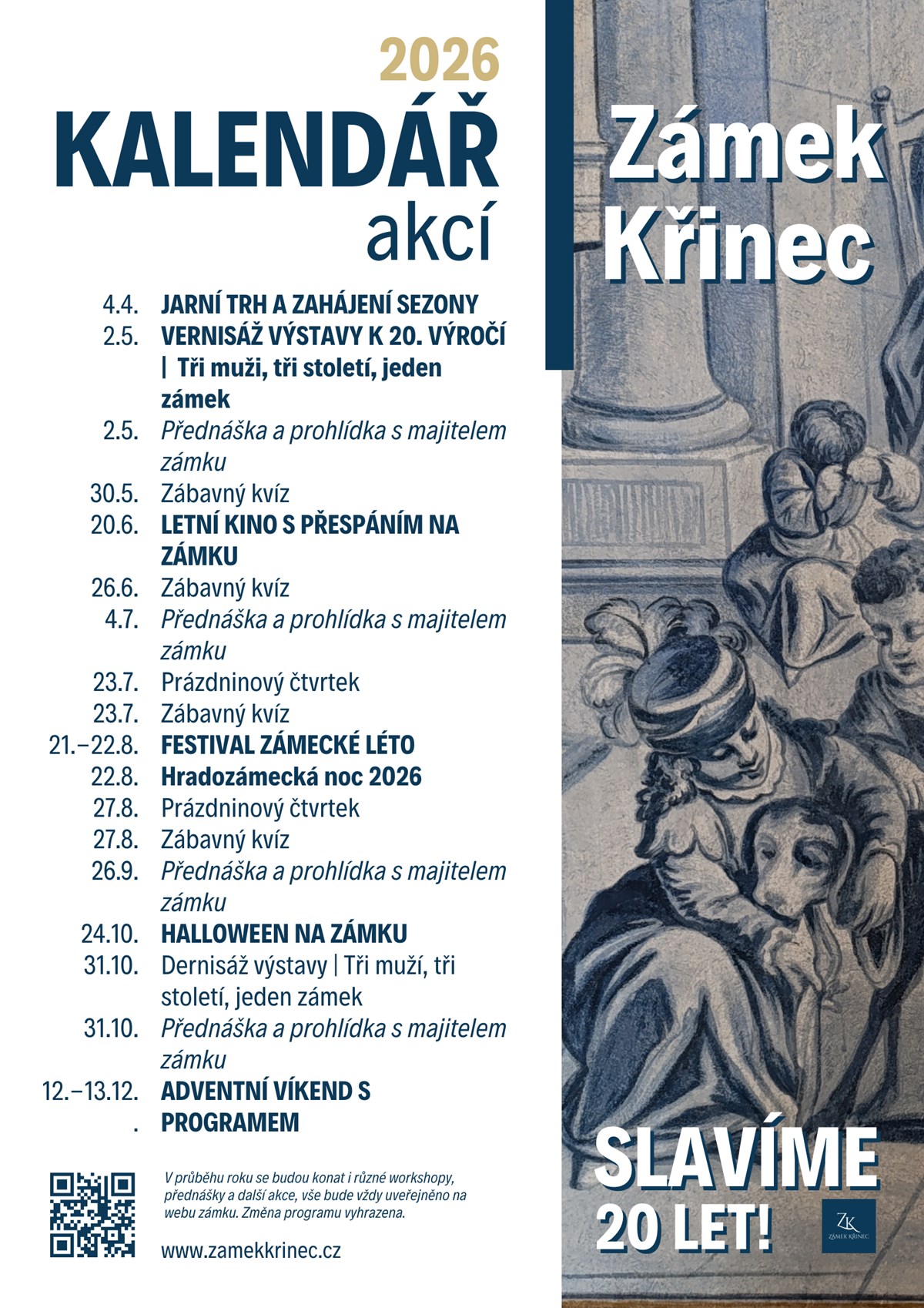 Zámek KřinecRodinný zámek ze 17. století nacházející se pouhou hodinu jízdy od Prahy ve Středočeském kraji je ideálním místem pro ty, kteří hledají unikátní prostředí pro svou svatbu, oslavu, firemní akci nebo jinou společenskou událost.Prohlídka křineckého zámku, to je jedno velké vyprávění o velmi turbulentní historii šlechtických rodů, které zámek v průběhu staletí postupně vlastnily a také ztratily. Jedná se o příběh vzletů, pádů a skoro definitivním zániku této mimořádně skvostné památky, která se díky nezměrnému úsilí současných majitelů, dochovala pro nás, a dochová se také generacím příštím. V rámci prohlídkového okruhu je možné si prohlédnout jak historickou a zrenovovanou část zámku s modrými salonky a barokním sálem, tak i v případě vašich časových možností i část s aktuálními výstavami, kde je možné nahlédnout do místností, které ještě rekonstrukcí neprošly a jsou tedy v "surovém" stavu.Letos slavíme 20. výročí, kdy dostal zámek svou druhou šanci na život a díky péči soukromého majitele začíná postupně vzkvétat. Přijďte se přesvědčit!