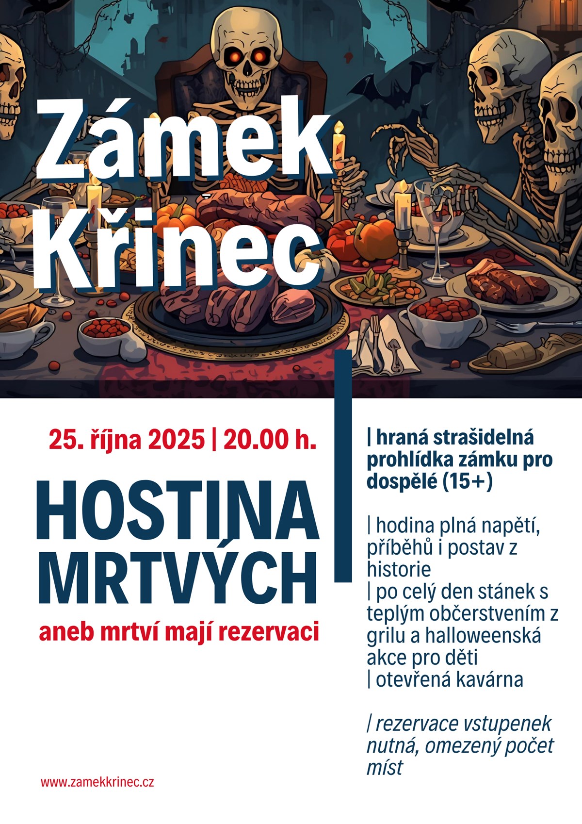 Zámek KřinecRodinný zámek ze 17. století nacházející se pouhou hodinu jízdy od Prahy ve Středočeském kraji je ideálním místem pro ty, kteří hledají unikátní prostředí pro svou svatbu, oslavu, firemní akci nebo jinou společenskou událost.VŠUDE JSOU STRAŠIDLA PRO DĚTI, MY MÁME ZÁBAVU I PRO DOSPĚLÉ! Úspěšná strašidelná prohlídka zámku Křinec je po roce opět zpět, tentokrát na téma HOSTINA MRTVÝCH ANEB MRTVÍ MAJÍ REZERVACI.Máte rádi napětí, rádi se bojíte, nebo jen chcete zkusit, jaké to je, se pohybovat v noci po rozlehlém zámku? Přijďte na prohlídku a toto vše zažijete na vlastní kůži! Před prohlídkou doporučujeme navštívit zámeckou kavárnu, nebo si pochutnat na dobré večeři z našeho pop-up stánku s burgery, polévkami a dalšími dobrotami. REZERVACE VSTUPENEK JE NUTNÁ VZHLEDEM K OMEZENÉ KAPACITĚ PROHLÍDKY. (Prohlídku doporučujeme pro návštěvníky opravdu od 15let a výše.) Po celý den probíhá program pro dětské návštěvníky, vstupenky k dispozici zde: www.smsticket.cz/vstupenky/61264-zamek-krinec-halloween-zamek-krinec?utm_campaign=smsticket-prodejni-box PROGRAM AKCE:13.30 | dětská strašidelná prohlídka14.30 | divadýlko14.30 | prohlídka pro dospělé16.00 | dětská strašidelná prohlídka17.00 | divadýlko17.30 -19.30 | dětská strašidelná diskotéka18.00 | vyhlášení nejoriginálnějšího kostýmu20.00 | HOSTINA MRTVÝCH aneb strašidelná prohlídka pro dospělé13.00-17.00/20.00 | dílničky, dlabání dýní, stánek s teplým jídlem z grilu, vláček pro děti10.00-20.00 | otevřená zámecká kavárnaOtevřená kavárna a občerstvení po celý den!Neváhejte a pořiďte si vstupenky včas – těšíme se na vás!