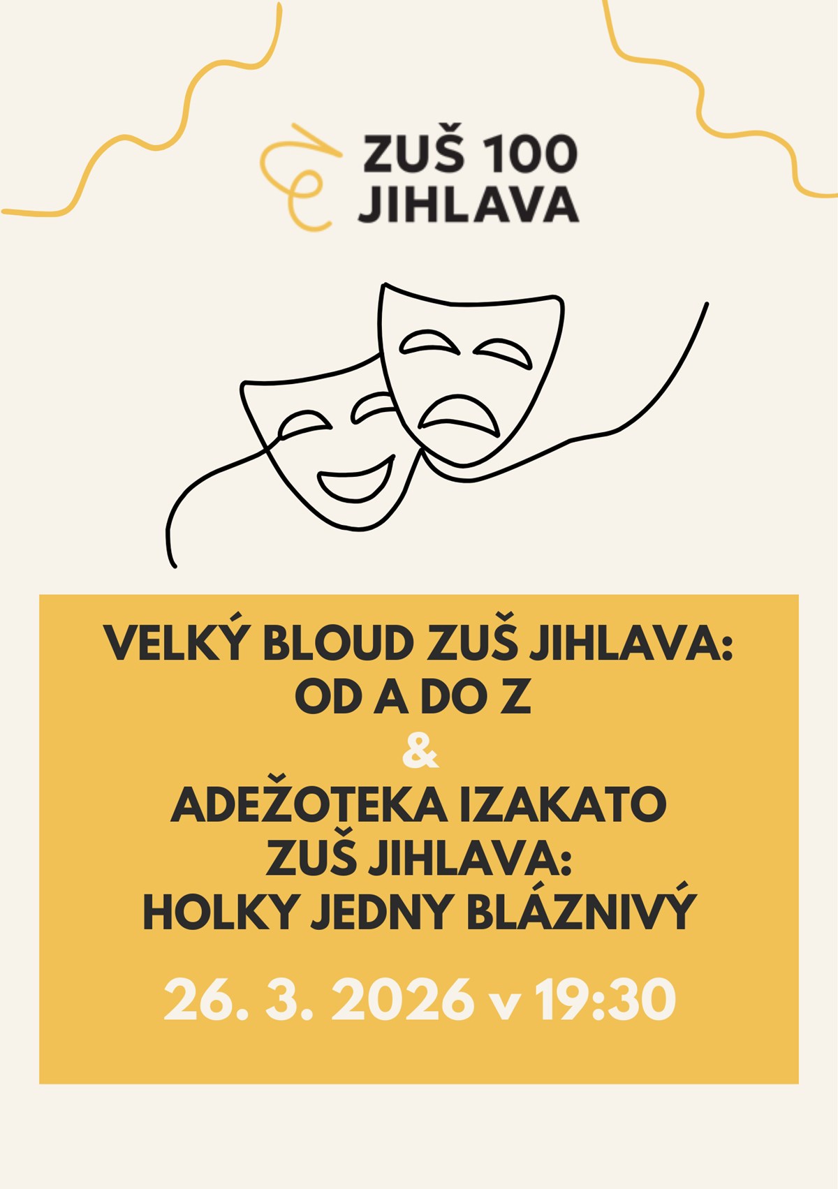 DVOJPREMIÉRA ZUŠ JIHLAVA: OD A DO Z a HOLKY JEDNY BLÁZNIVÝVelký bloud ZUŠ Jihlava uvádí: OD A DO ZDobrodružná cesta ke studnici vědění. AZ kvíz máme všichni doma v obýváku, ale Brno je dál, než se zdá, a dálnice nevede úplně rovně.Hrají: Jan Jiří Jindra (Franta, gangster), Matyáš Kohout (Aleš), Emma Emílie Kostková (Veselá), Bára Nováková (Helena), Kateřina Olišarová (ségra, psychopat, gangster), Šimon Spěváček (Šimon), Johana Vavrdová (babička), Eliška Vochyánová (Hrozná), Marie Vyhnanovská (Eva) a Babora Zelníčková (Marcela)Režie: Martin Kolář a Velký bloudPŘESTÁVKAAdežoteka izakato ZUŠ Jihlava uvádí: HOLKY JEDNY BLÁZNIVÝVe skladu obchodního domu Světluška se nepracuje tolik, jak byste možná čekali. A to ani když přivezou banány.Hrají: Izabela Bednářová (Andrea), Tereza Fialová (Hrubá), Adél Homoláčová (Dlouhá), Tomáš Olišar (Hrůza), Kateřina Přikrylová (Justýna), Karin Szabo (Patricie) a Žofie Žatečková (Boží)Režie: Martin Kolář a Adežoteka izakato